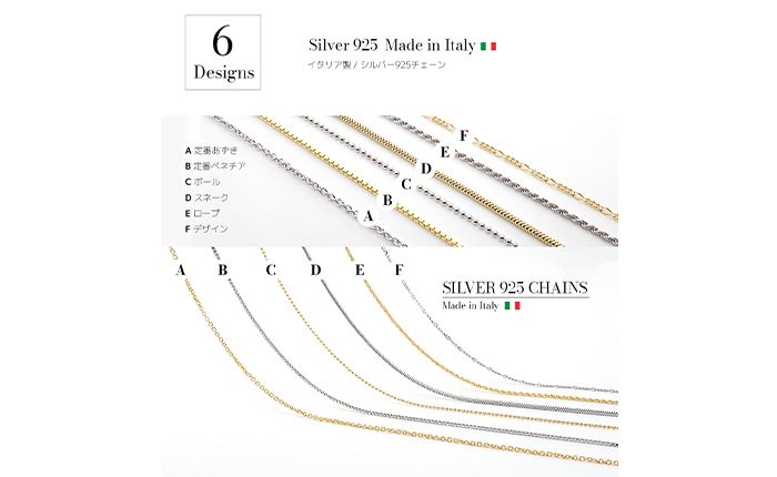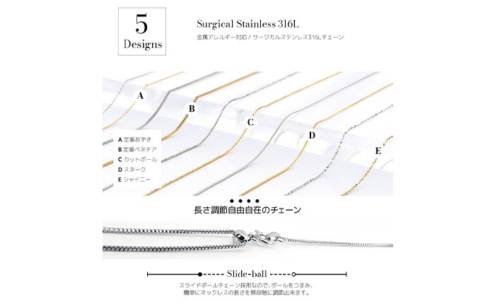当店ではサージカルステンレス316Lの5種類のデザインとシルバー925の6種類のデザイン、シルバー色とゴールド色の2色のカラー展開となっております。