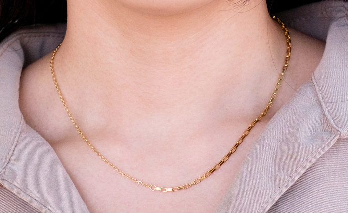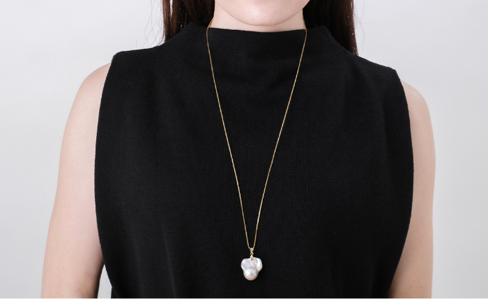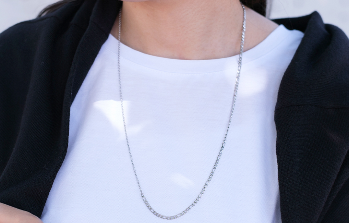 トップスの厚さによって、装着したネックレスの見た目の長さが変わるため、季節に合わせてチェーンの長さを変化させるとコーディネートが一段と映えるものに変わります。