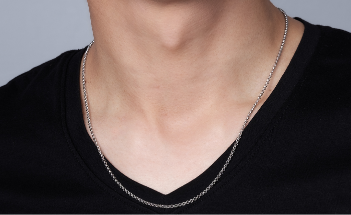 50cmは男性向けネックレスの標準的な長さ。薄手のTシャツやカットソーと合わせると綺麗に見えます。