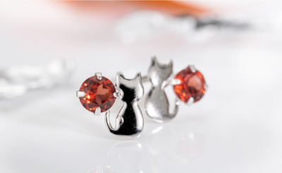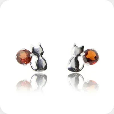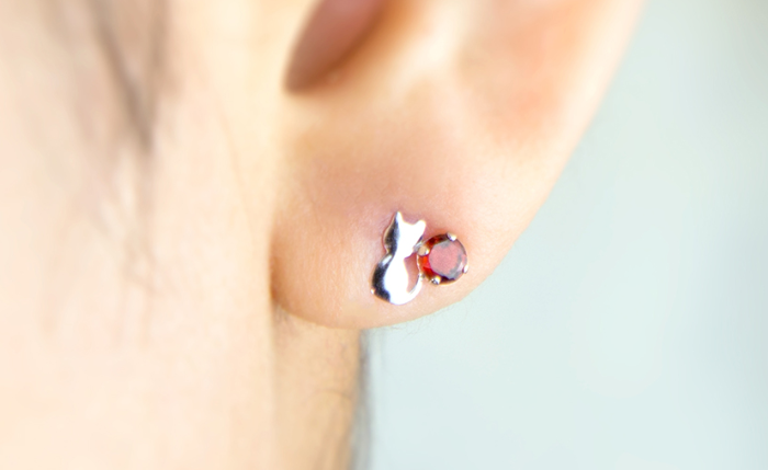 ガーネットに猫が寄り添う愛らしいピアス